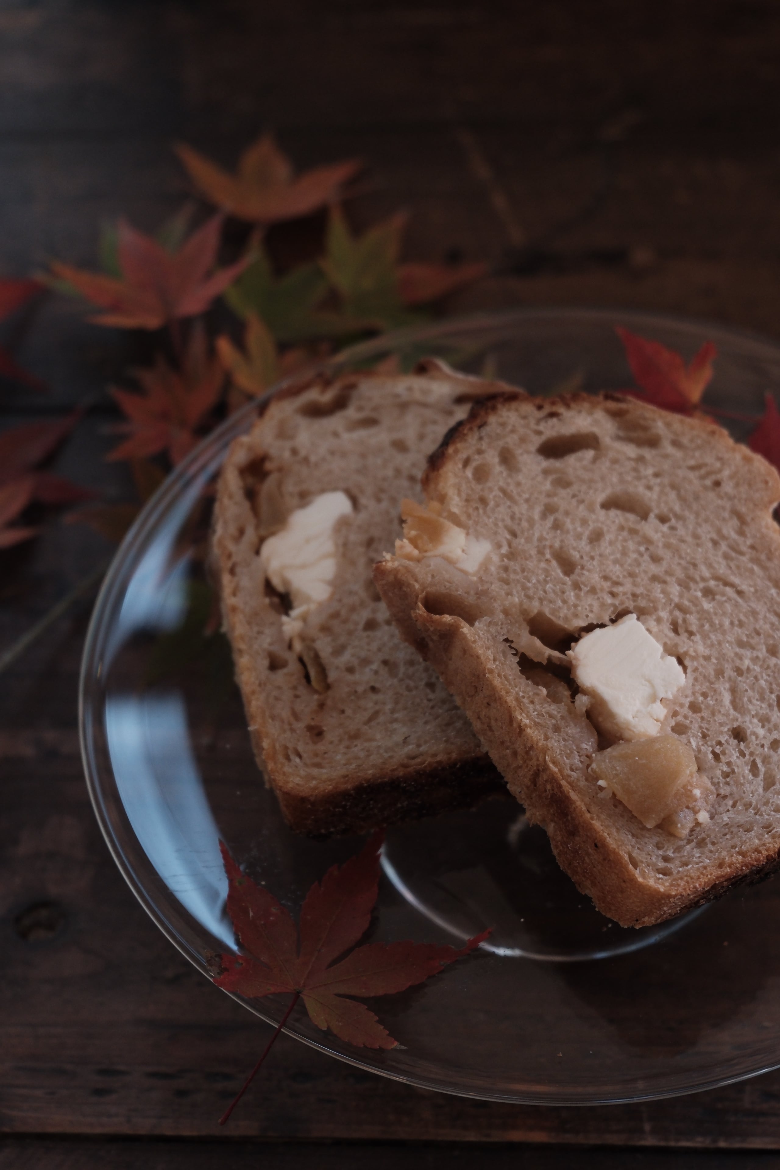 パンを成形する時にキャラメルりんごと一緒に自家製のキャラメルバターを入れパン生地で包みます。